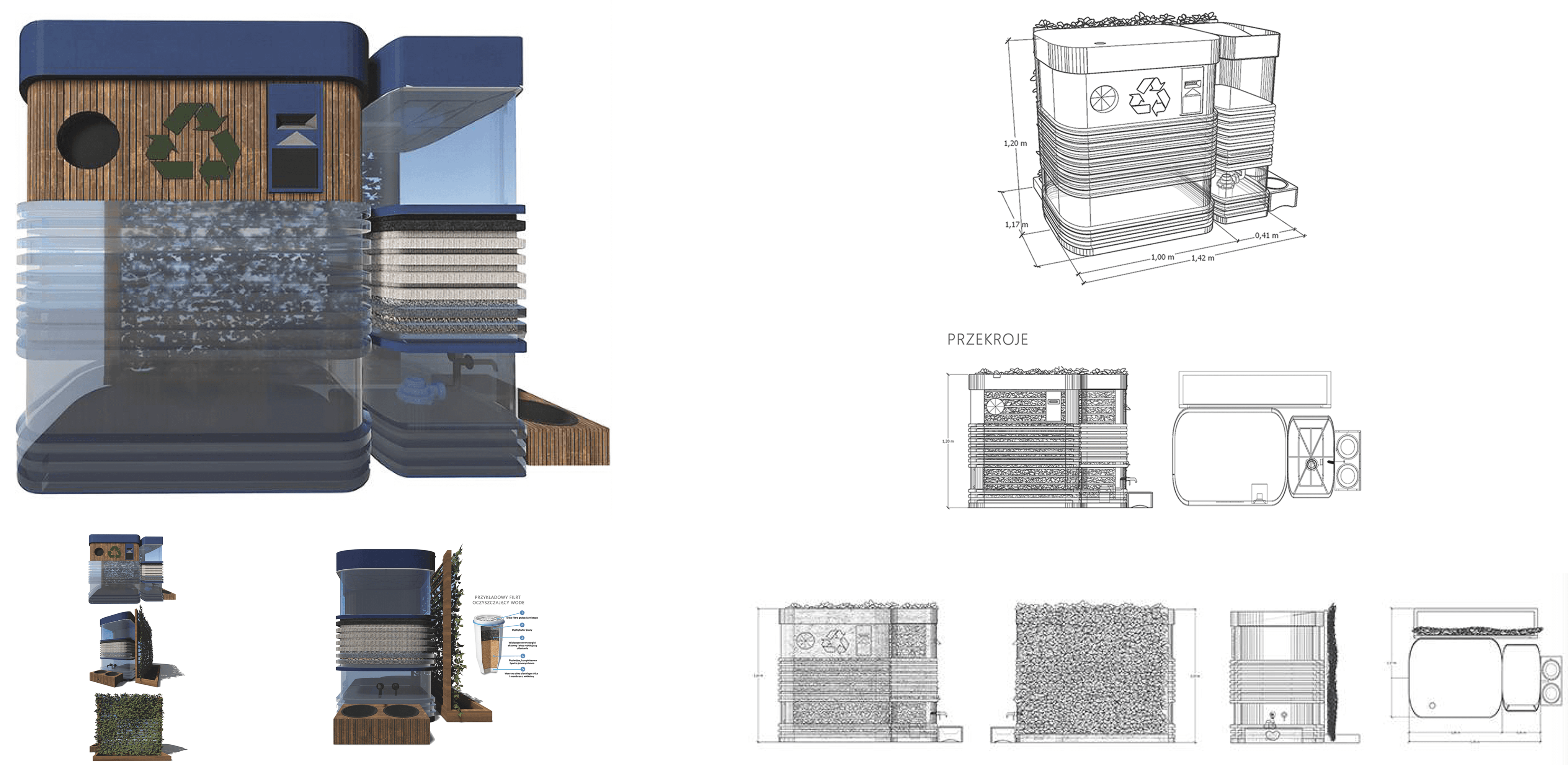 A recycling machine, designed to be easily placed in various parts of the city. Its purpose is to encourage people to take care of the environment by recycling plastics. A special tank with a rainwater cleaning function is also installed at the machine. The water passes through the next visible filter layers, thanks to which the entire process can be observed. The water is intended for washing hands or for animals.